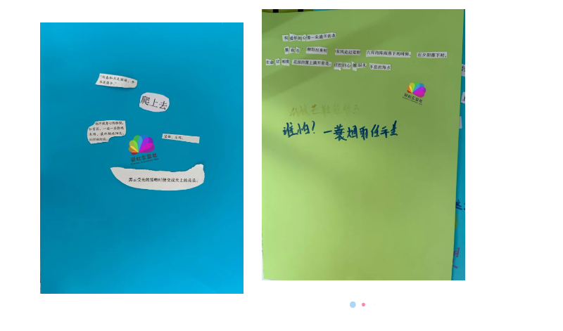 小洋认真选取了一张蓝色的卡纸,然后从诗歌、文章等素材找到了“爬上去”“坚强、乐观”……这一个个词语、句子就是小洋内心中最深刻的声音——疾病不会真正束缚住我,我一定会用最积极乐观的态度面对来自生命的挑战!