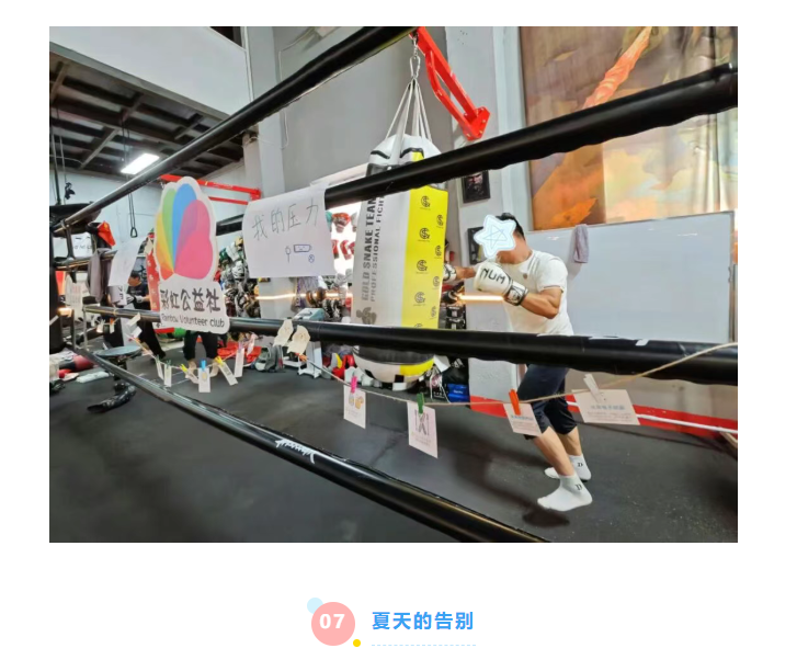 在拳击馆教练的带领下,爸爸们进行了拉伸和热身活动。他们在便利贴上写下“疾病”,将便利贴粘在沙袋上,他们向沙袋一拳拳挥过去,将内心中积蓄的难过和压力抒发了出来,也像是想帮小朋友打跑这些病魔。